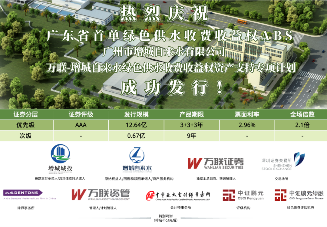 9月,13.31亿元绿色供水ABS成功发行,为广东省首单绿色供水收费收益权ABS,创2023年以来全国同期限供水行业ABS产品票面利率新低。